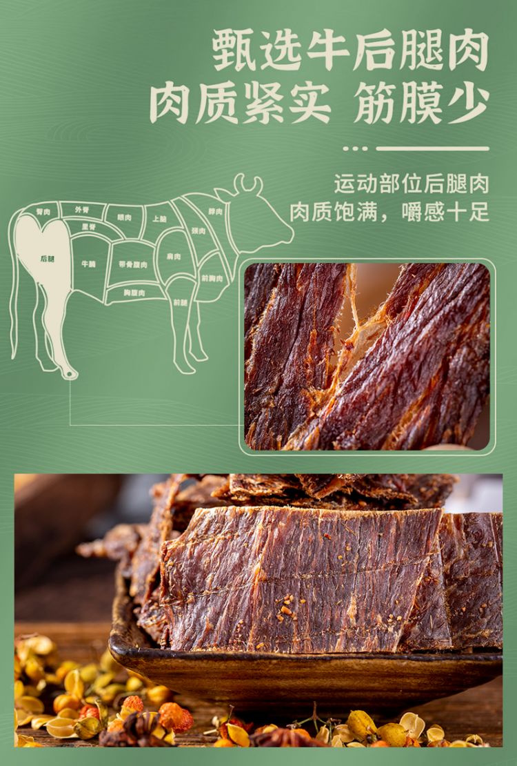 选用土黄牛精华部 全无脂肪的“后腿肉” 会有丰富的胶原蛋白和筋建甜度高 有嚼劲