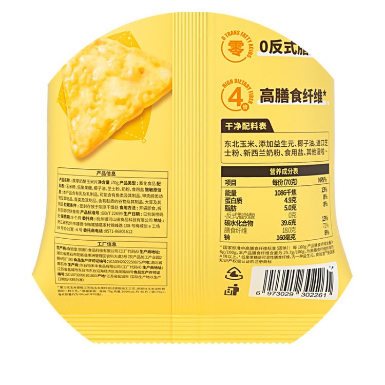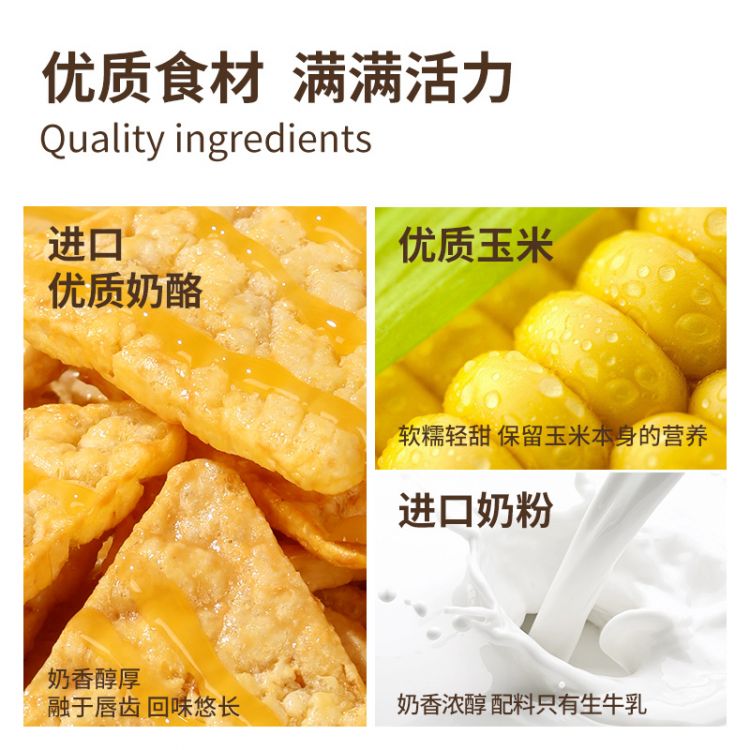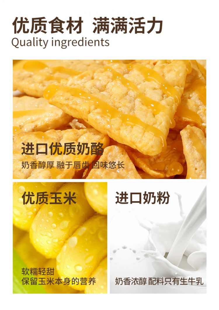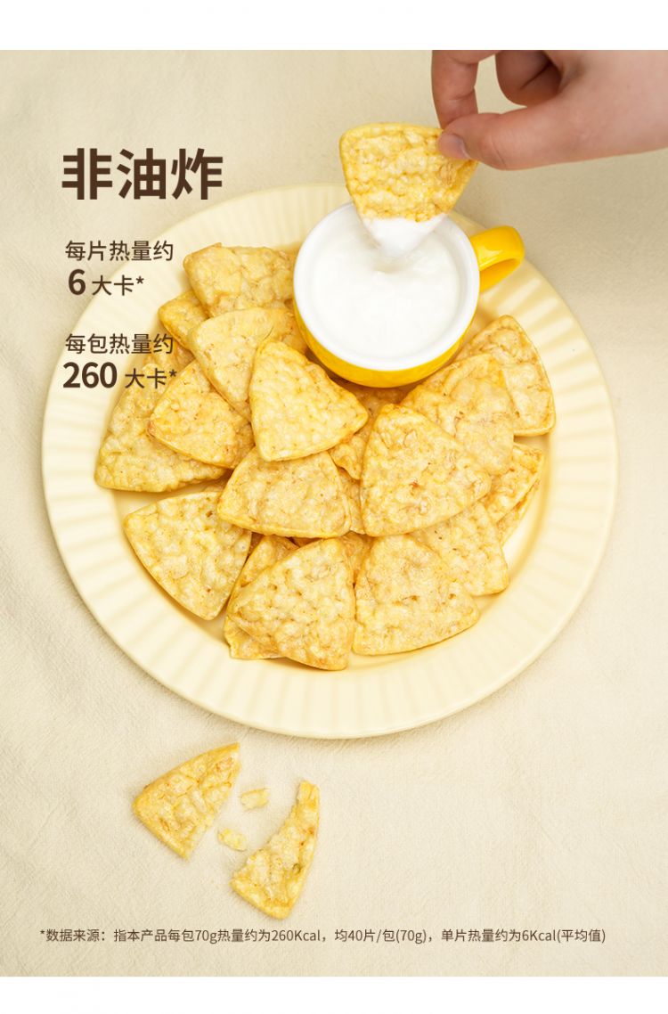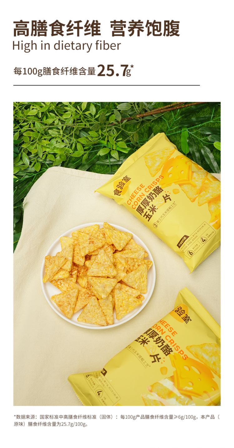 进口奶酪,添加益生元,非油炸,厚实奶酪,咸香酥脆 进口奶酪、奶粉,粗粮基底,膳食纤维含量高达25.7g/100g,非油炸,0反式脂肪酸