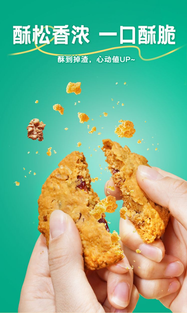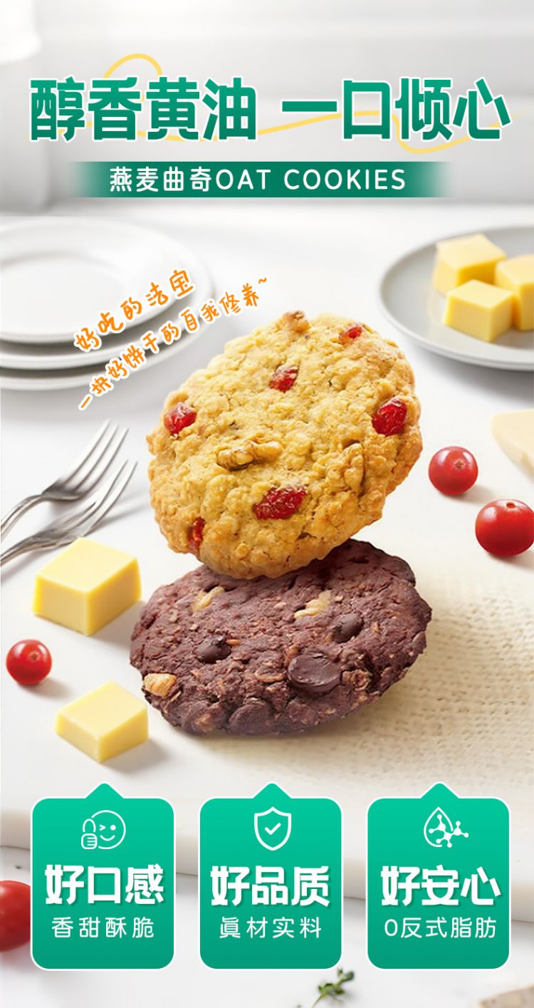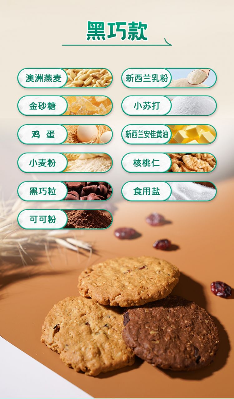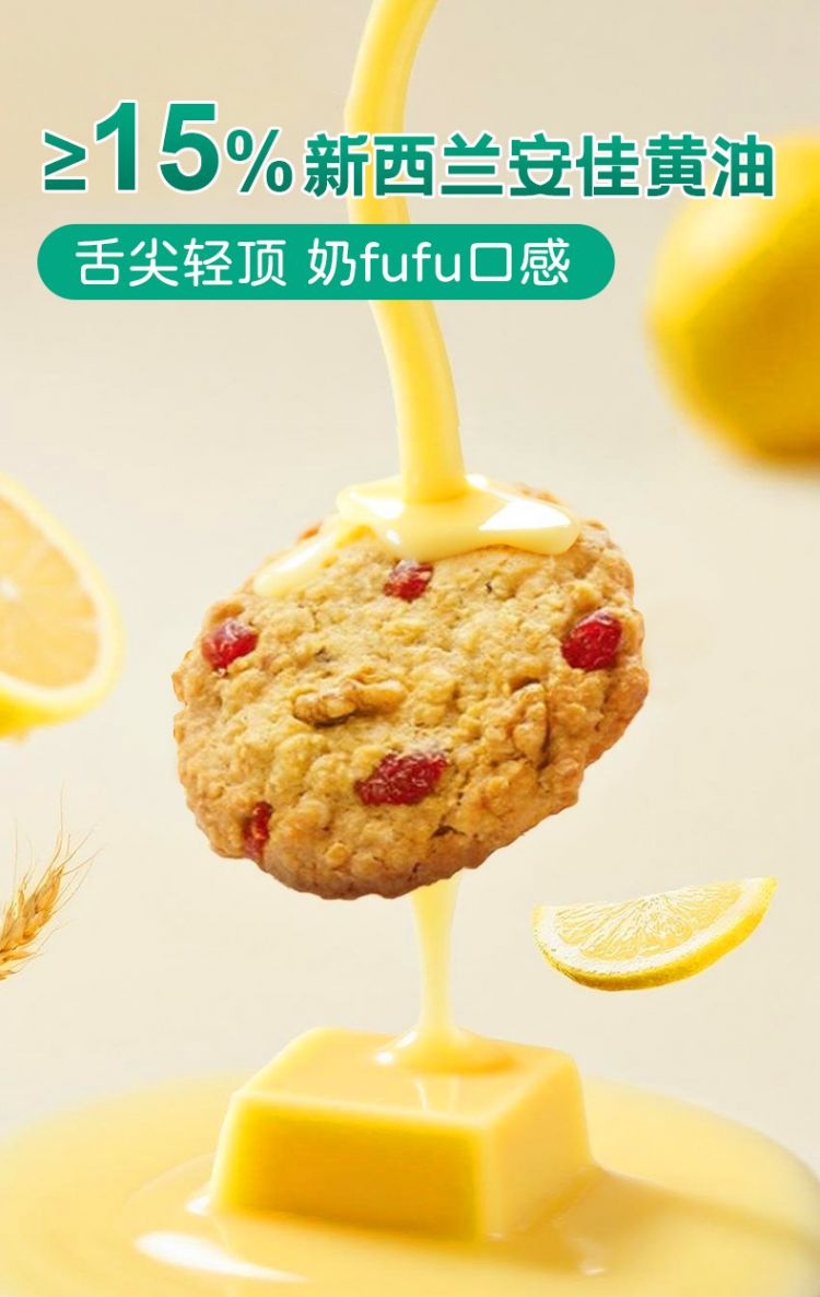 甄选澳大利亚燕麦>23% 新西兰黄油>15%! 酥松香浓 入口即化 健康美味!、0反式脂肪酸 金砂糖代替白砂糖∨饱腹感强