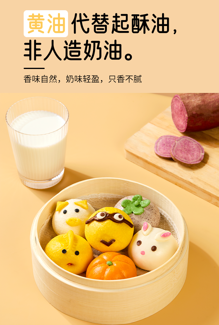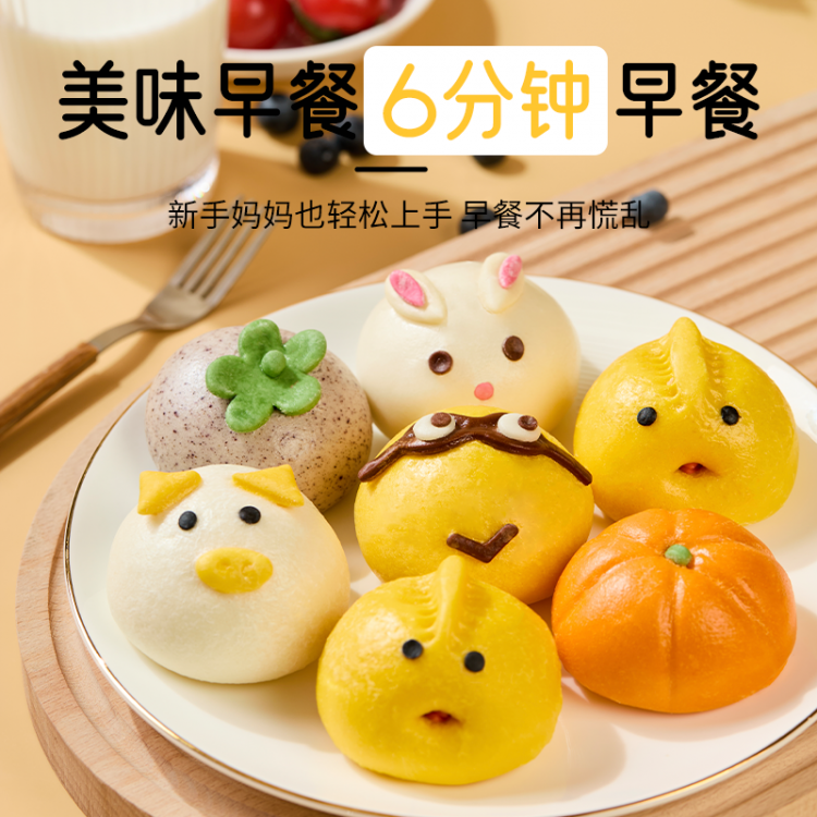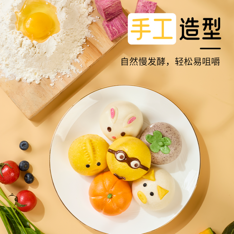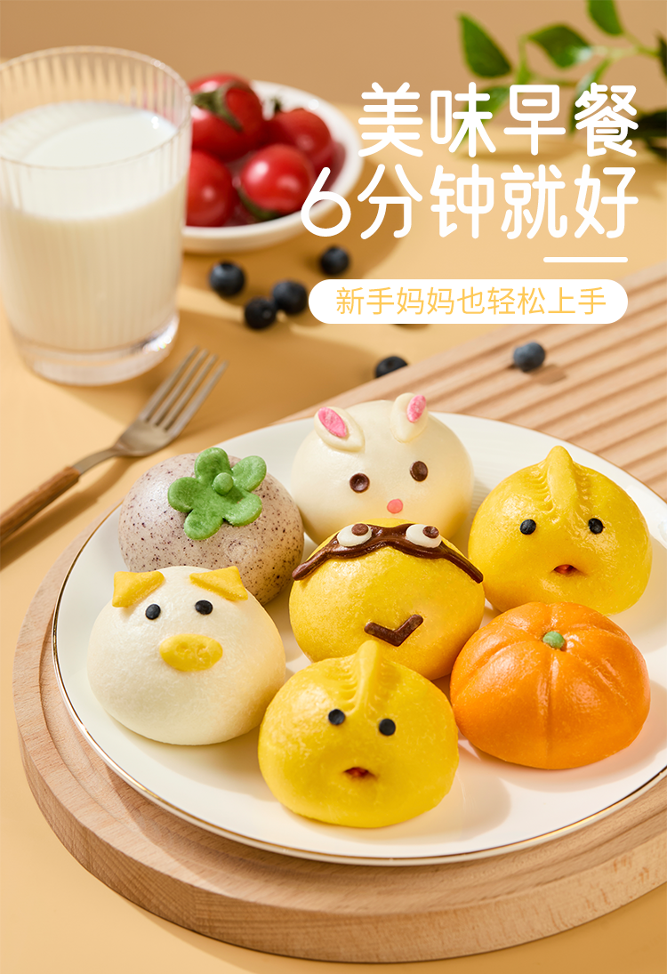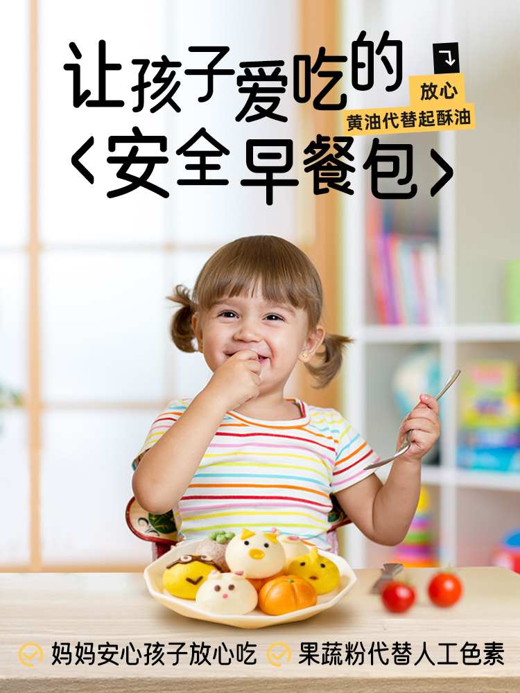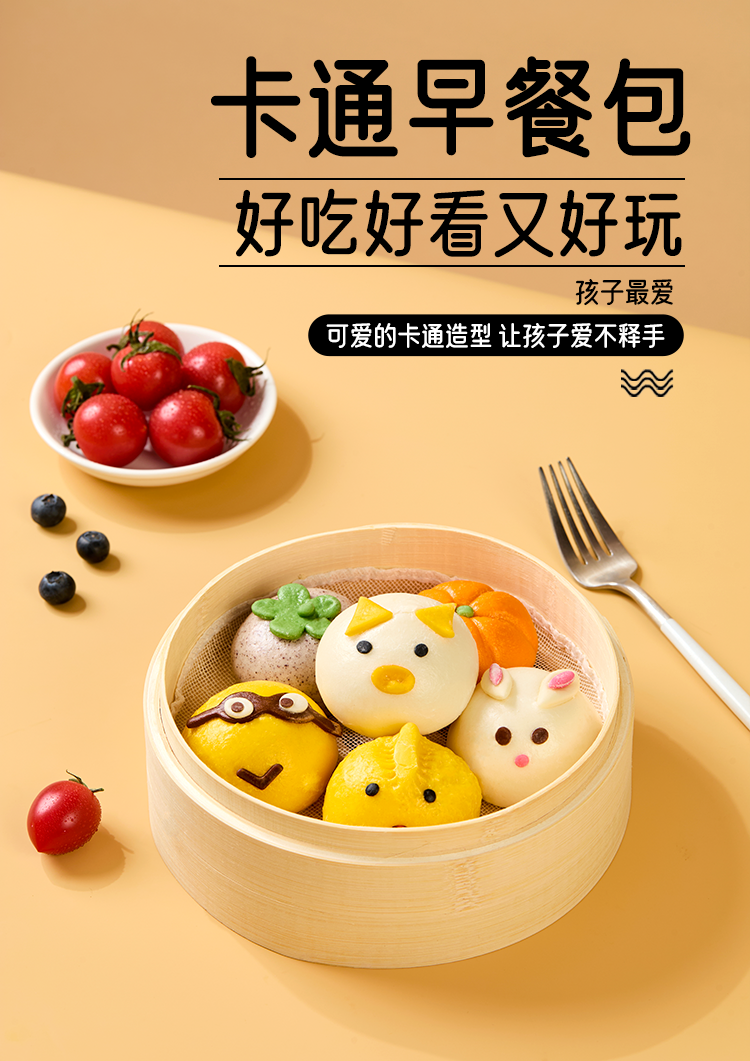 1.萌趣卡通早餐包,好吃好看又好玩:2.健康原料,手工造型,自然慢发酵,口感松软,易咀,专为儿童设计:3.美味早餐,6分钟就好,新手妈妈也能轻松上手.