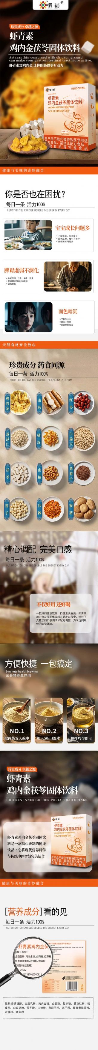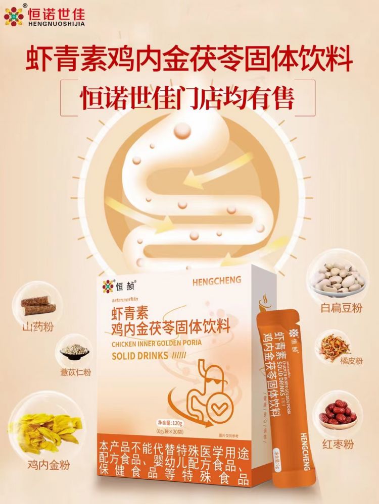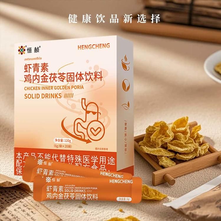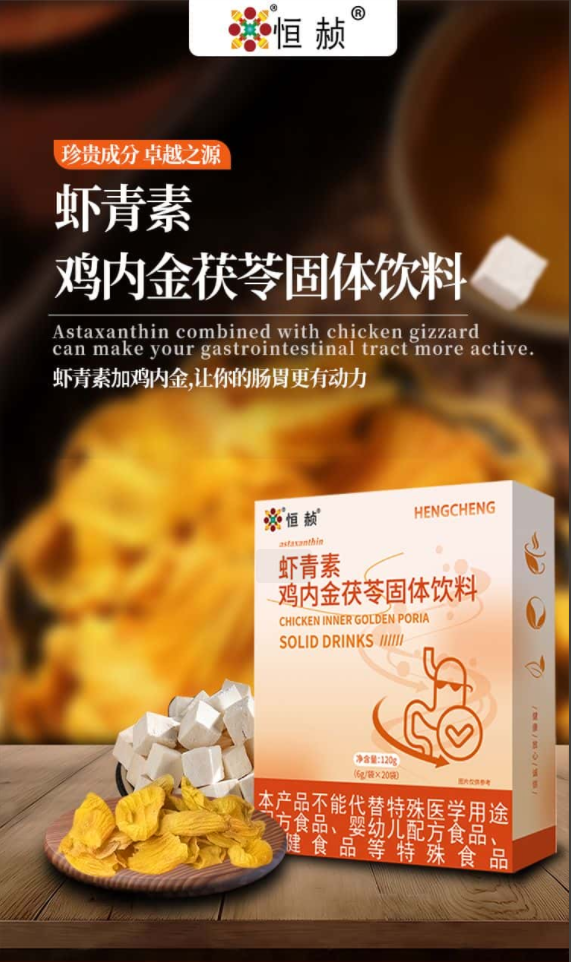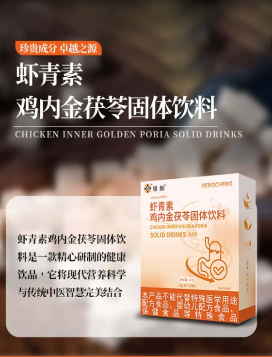 产品特点:虾青素具有强大抗氧化性,可抵御自由基、延缓衰老、抗疲劳等;鸡内金能健脾胃、助消化;茯苓可利水渗湿、健脾宁心。三者组合成的固体饮料在养生保健、预防疾病等多方面有着综合的健康效益!